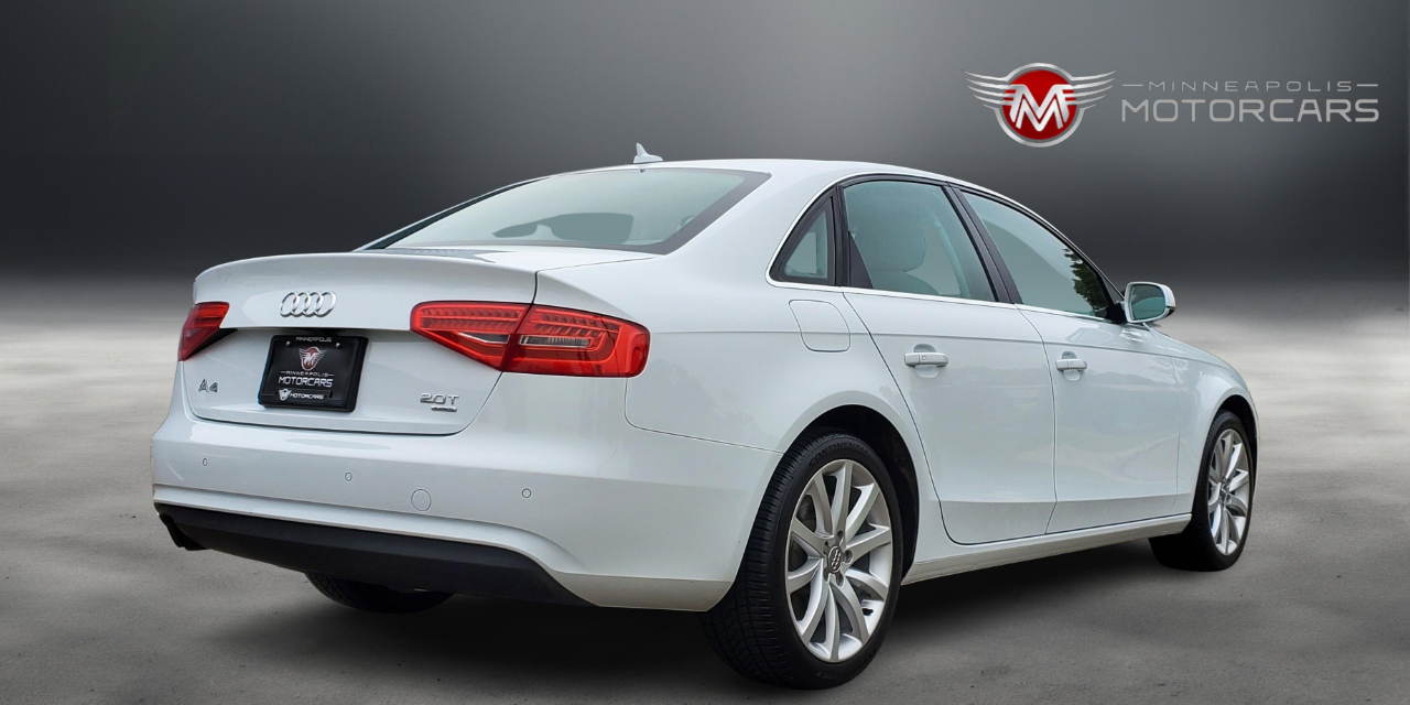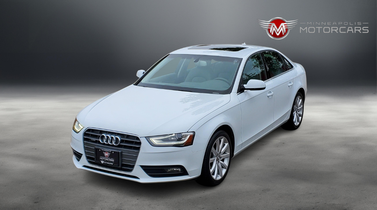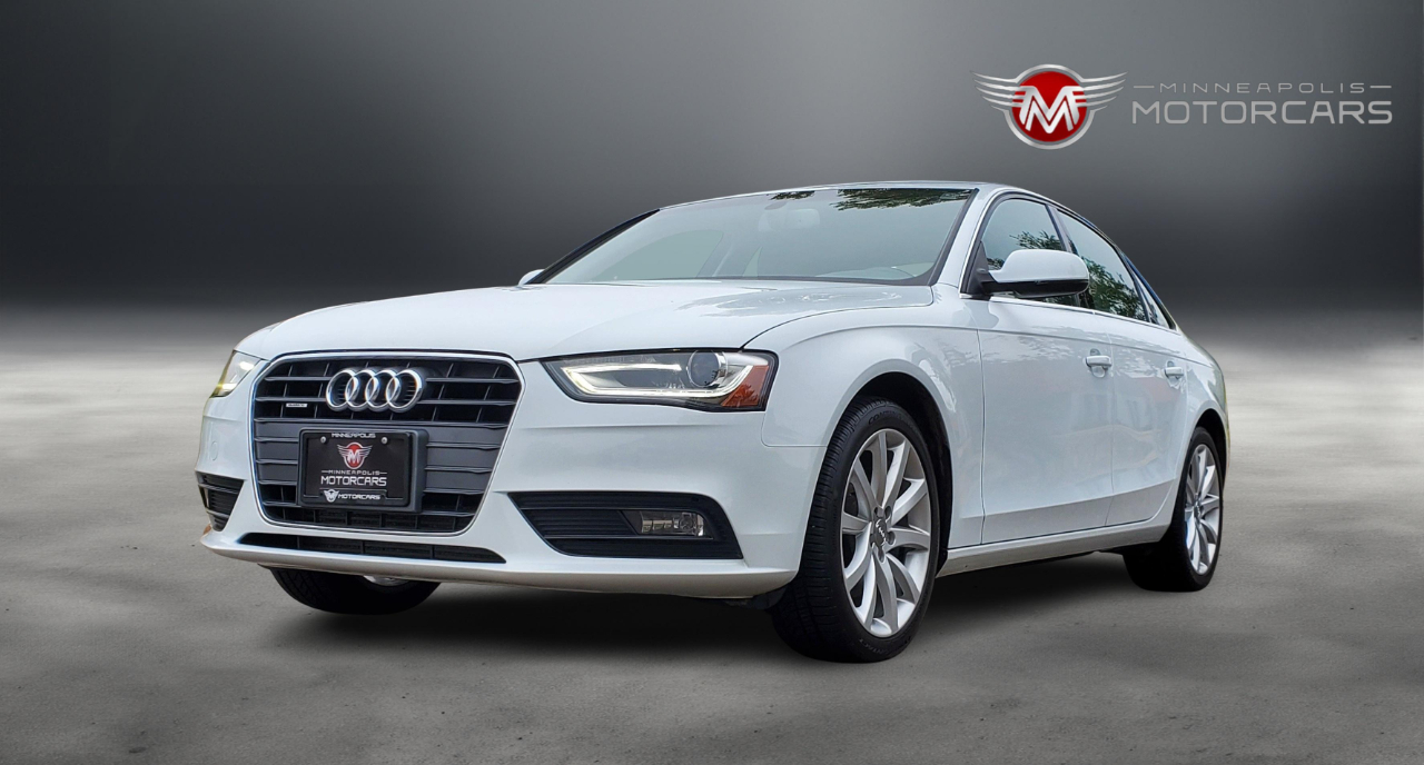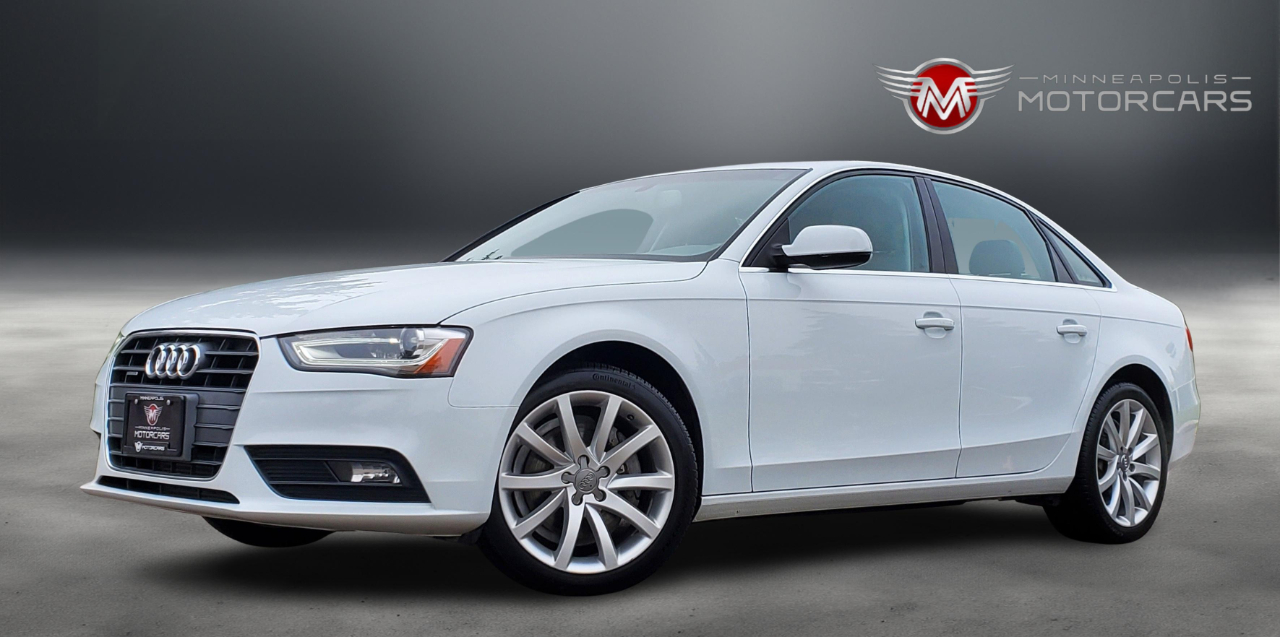 2013 Audi A4 2.0T Prestige Quattro. Carfax Certified 1 OWNER. White on Gray Leather. Navigation, Blind Spot Monitoring, Back up Camera, Heated Seats, Bang Olufsen Sound, Sunroof. A Well Maintained Example! ***** Indoor Showroom***** Carfax report with every vehicle. We buy, sell, trade and offer financing. Affordable service warranty contracts available. ***** Please schedule a showing for your convenience. ***** BY APPT ***** Contact Sam @ 612-707-2100 ***** Small, Simple and Nice Cars. ***** Enjoy your car buying experience again! Thank You for Visiting Minneapolis Motorcars!*****