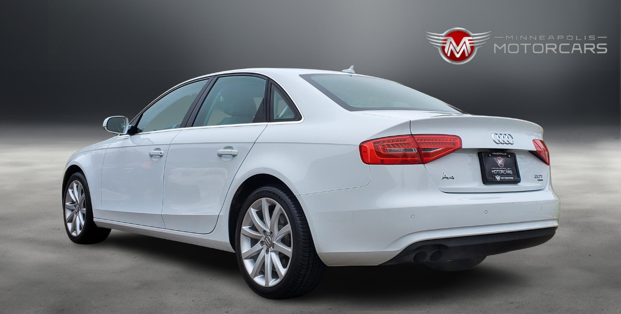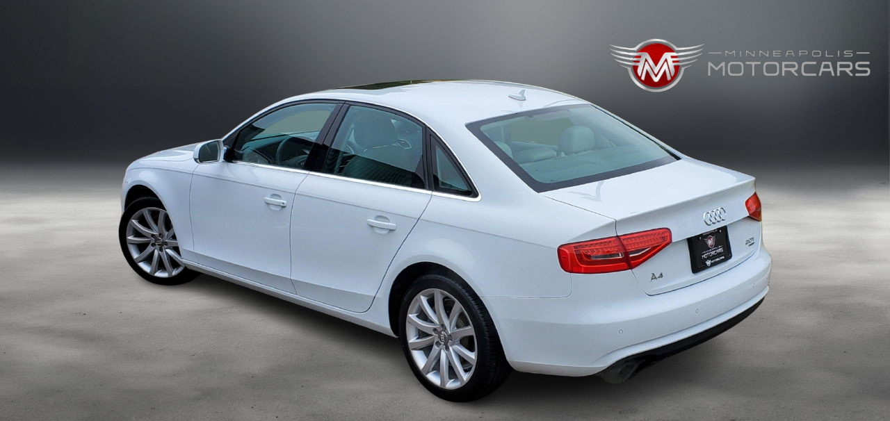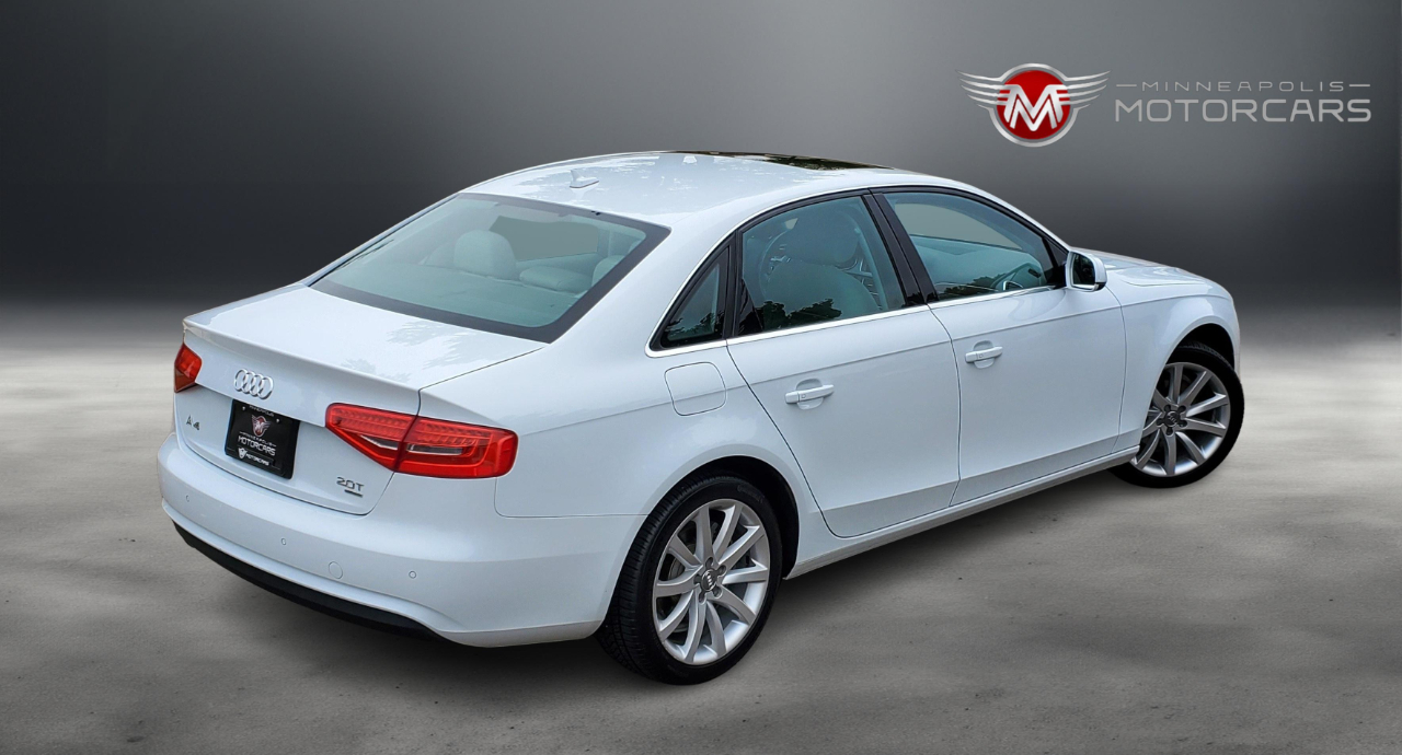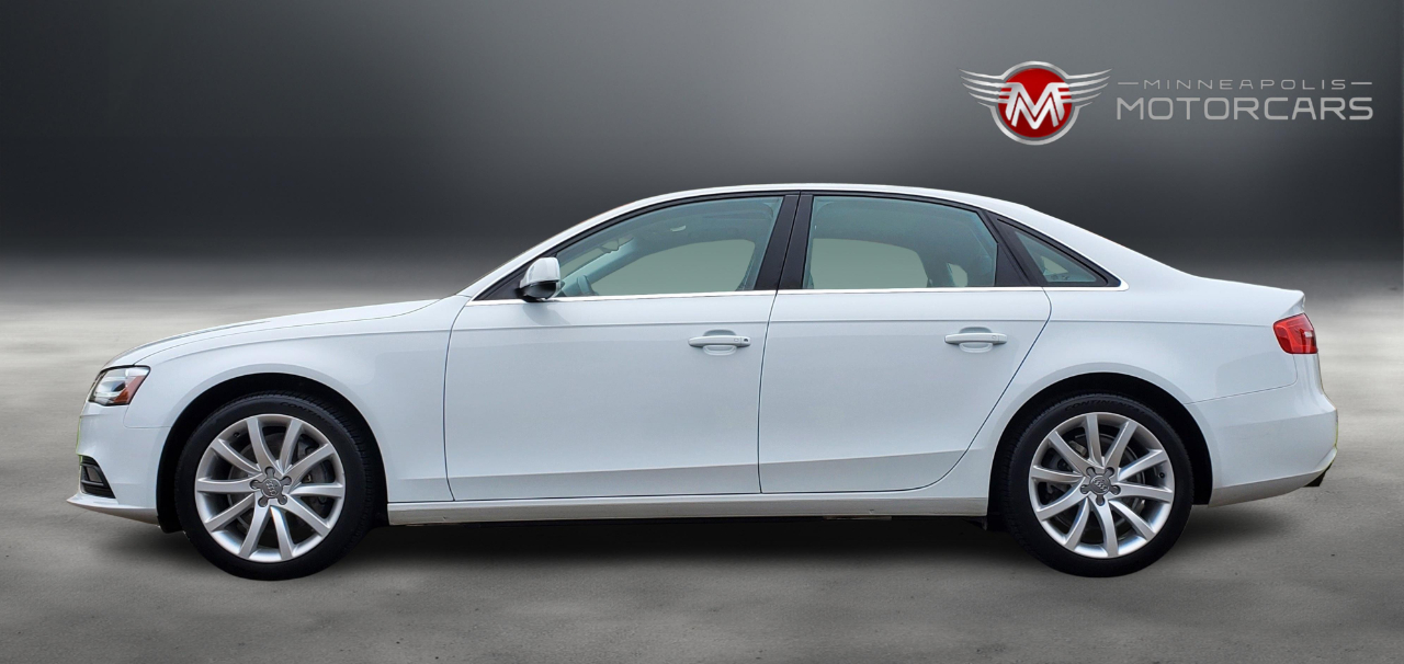 2013 Audi A4 2.0T Prestige Quattro. Carfax Certified 1 OWNER. White on Gray Leather. Navigation, Blind Spot Monitoring, Back up Camera, Heated Seats, Bang Olufsen Sound, Sunroof. A Well Maintained Example! ***** Indoor Showroom***** Carfax report with every vehicle. We buy, sell, trade and offer financing. Affordable service warranty contracts available. ***** Please schedule a showing for your convenience. ***** BY APPT ***** Contact Sam @ 612-707-2100 ***** Small, Simple and Nice Cars. ***** Enjoy your car buying experience again! Thank You for Visiting Minneapolis Motorcars!*****